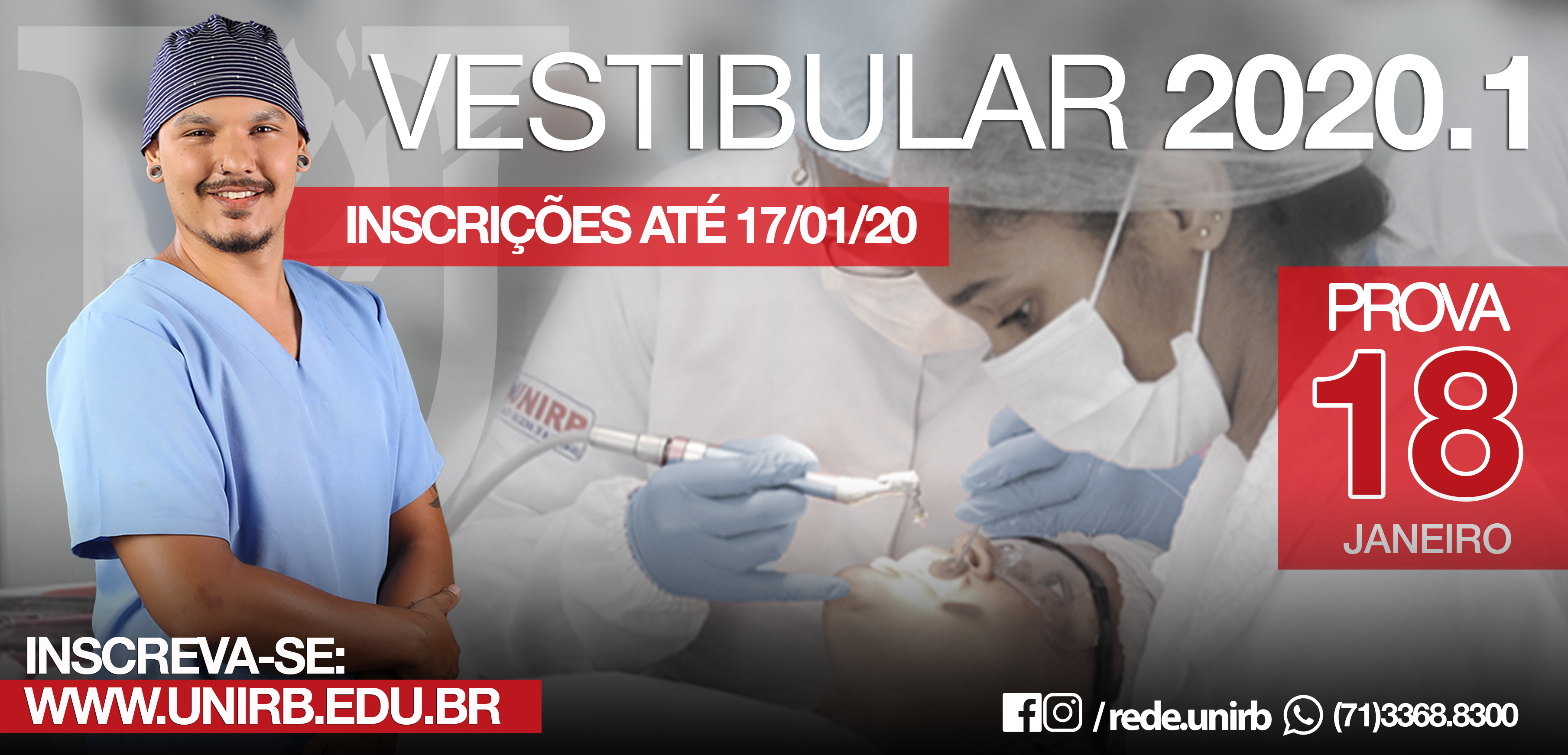 A Rede UNIRB realizará vestibular no dia 18 de janeiro em todas as unidades. Os interessados em realizar a prova podem fazer a inscrição, gratuita, no site www.unirb.edu.br. O exame acontece às 14h. A Rede oferta mais de duzentos e oitenta opções de cursos distribuídos nas unidades. As formas de ingresso no ensino superior se dão também por meio do vestibular agendado, portador de diploma, transferência externa e nota do Enem.